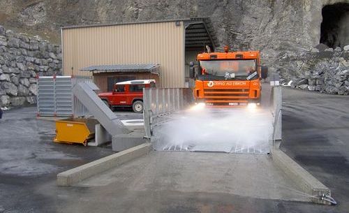 Проходные мойки для грузового транспорта — устанавливаются на выездах с промышленных территорий или строительных площадок. Машина заезжает на платформу, и система автоматически очищает колеса и нижнюю часть кузова.